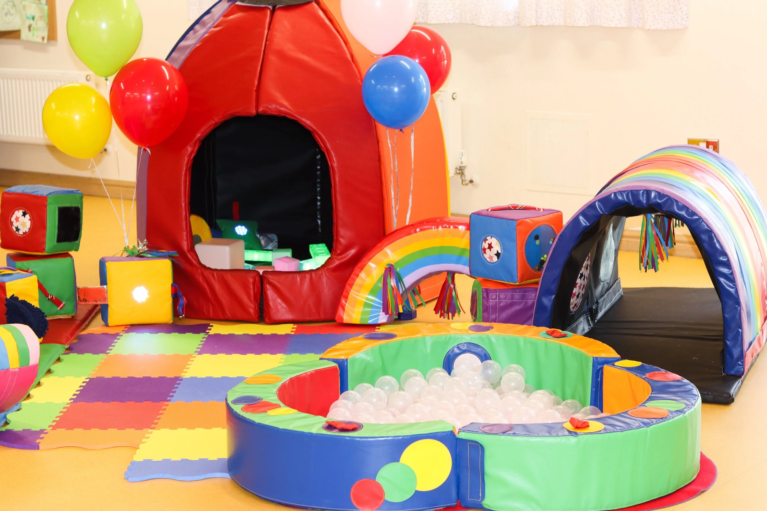 4ft Party Pod, Sensory Tunnel, Sensory Tactile Mat, Sensory Cubes, Sensory Light Cushions, Rocker and Baby Ball Pool (if required).